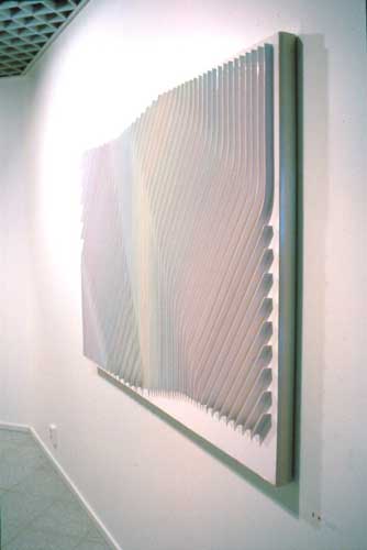 of ice After working with wood and metal for several years, Auli Korhonen tack up a new material: glass. Attraction is a sculpture made from cut and piled green glass plates. The movement of light in the material is of central interest.ln Korhonen's earlier works, the movement was upwards and outwards reaching for the universe, while Attraction sucks the viewer in itself. Its dynamics are concerned with experiencing the depths that light penetrates. Strength and physical essence are new elements in Korhonen's glass works. This could imply that the spirituality of her former reliefs and the return to the period of self-portraits are closely combined in them. The works give rhythm to the gravity that generates life in the prime sea. However, reflection and thought are clearly manifested. Primitive strength is not running wild in its shapes hut the work has its own distinct logic. It is controlled. The artist's way of thinking and the inner strength of the material create a tension within the work; they attract each other. |